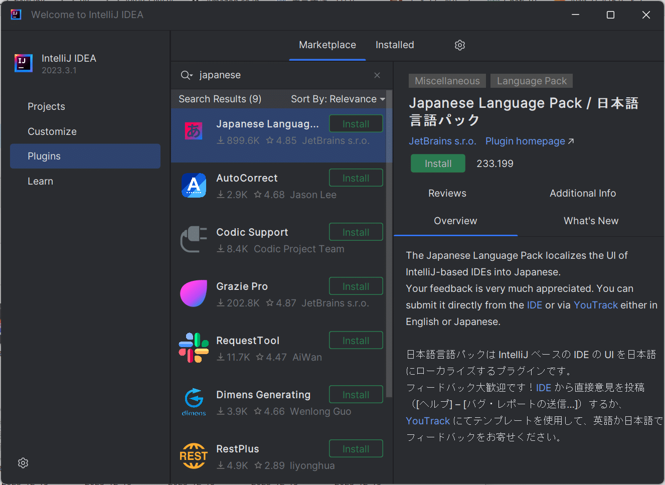 Intellijを起動してランチャーメニューになったら、サイドバーのPluginsタブから Japanese Language Pack と検索してインストールします。 インストール後に Intellij を再起動すれば日本語化が反映されます。